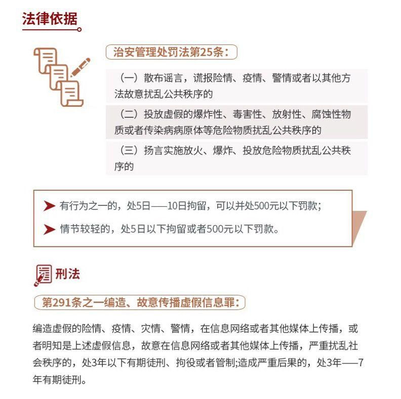 編造虛假的險情、疫情、災情、警情,在信息網絡或者其他媒體上傳播,或者明知是上述虛假信息,故意在信息網絡或者其他媒體上傳播,嚴重擾亂社會秩序的,處3年以下有期徒刑、拘役或者管制; 造成嚴重後果的,處3年一7年有期徒刑。