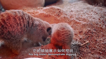 像是和姐姐學「刨坑」,在野外,狐獴會挖出2米深的複雜洞穴,會設計十多個出口,可以説算是看家本領之一。