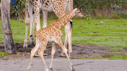 一臉不高興的長頸鹿幼崽,脖子以下全是腿,走起路來很優雅: