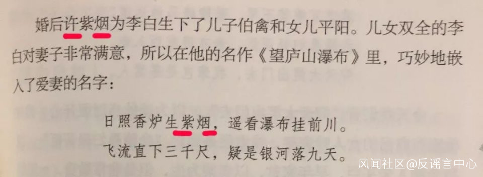 現在竟然有人東扯西扯,聲稱“紫煙”不是瀑布飛流直下時,霧氣受到陽光照射後產生的現象,而是李白妻子的名字;然後夫妻恩愛美滿,育有一兒一女……