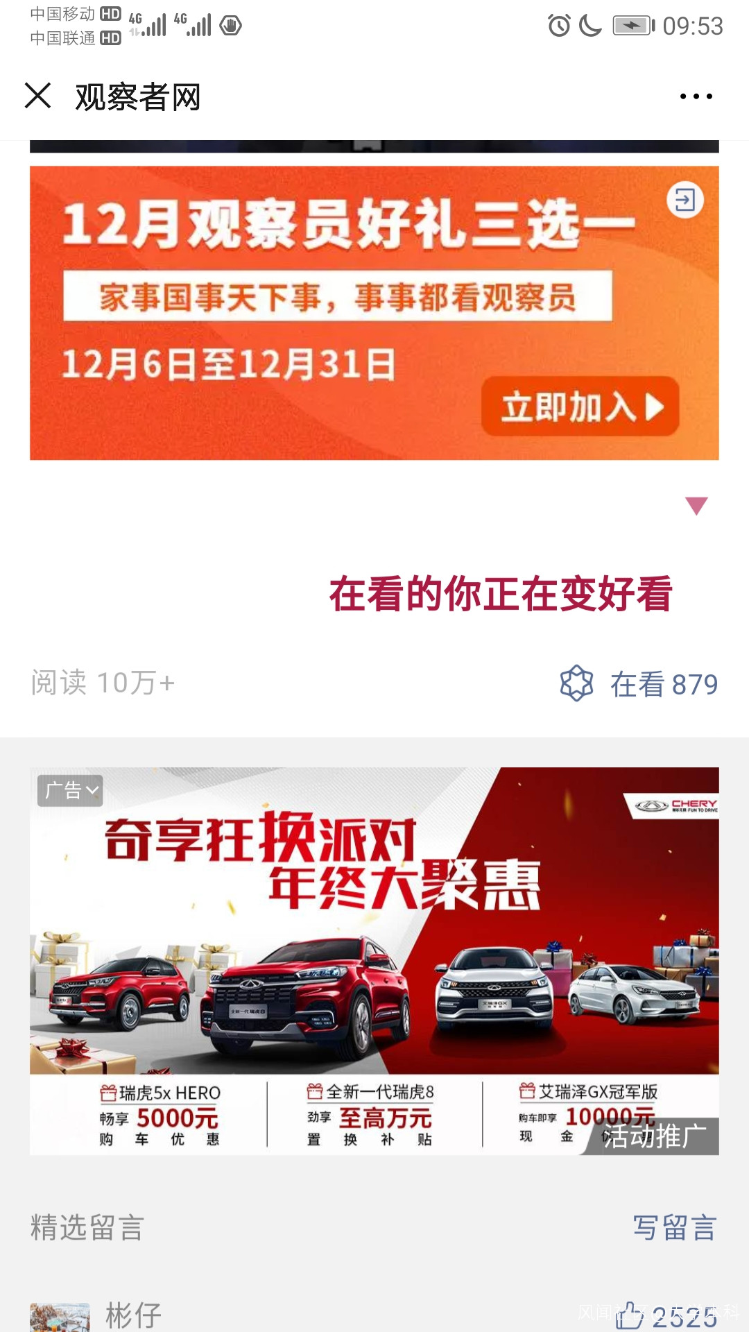 再看觀察者網的廣告方式,由於我沒有微博,也懶得去找微博,我只查了一下觀察者網微信公眾號的廣告,你把每一篇文章拉到留言位置,就能看到廣告就在留言的上面,