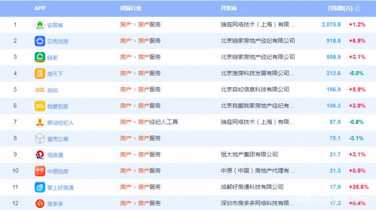 根據易觀指數“房產”關鍵詞搜索得出的數據,房多多排在12名,月活(月均活躍用户)指數為17.3萬,而排名前列的安居客、貝殼兩家品牌月活指數則分別是2070.8萬、918.8萬。12家品牌中房多多的月活增速為0.4%,僅高於三家月活量負增長的公司。