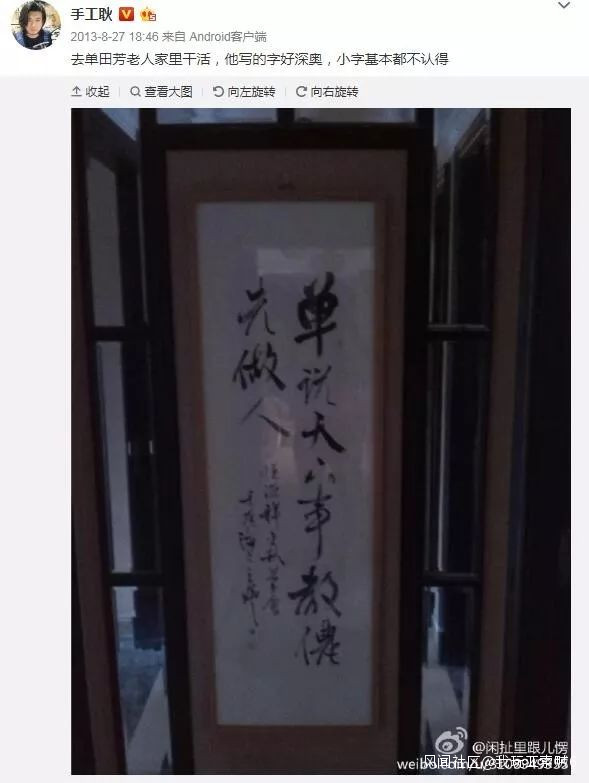 他唯一和娛樂圈產生的聯繫是,他去單田芳老人家裏幹活,發了一條微博,説自己基本看不懂牆上掛的那幅字。