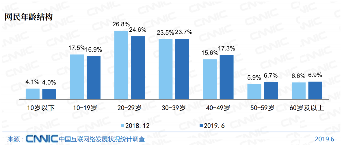 根據CNNIC發佈的第44次《中國互聯網絡發展狀況統計報告》顯示,截止到2019年6月份,國內網民規模已經達到8.54億,其中30—39歲網民佔比從2018年底的23.5%增至23.7%,40—49歲網民羣體從15.6%提升至17.3%,50歲以上的網民羣體從12.5%提升至13.6%。儘管95後、00後等“互聯網原住民”已經站上舞台中心,互聯網持續向中高齡人羣滲透卻是不爭的事實。