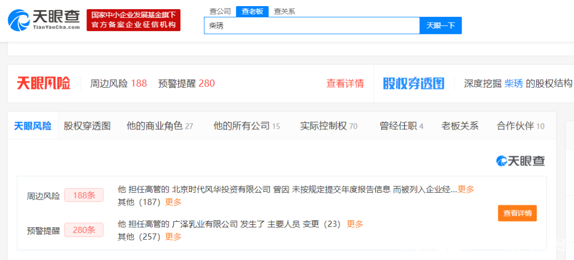 天眼查數據顯示,柴琇相關的周邊風險達188條,包括經營異常、股權出質以及法律訴訟等。同時,與柴琇相關的預警提醒達280條,包括其擔任高管公司的變更信息。
