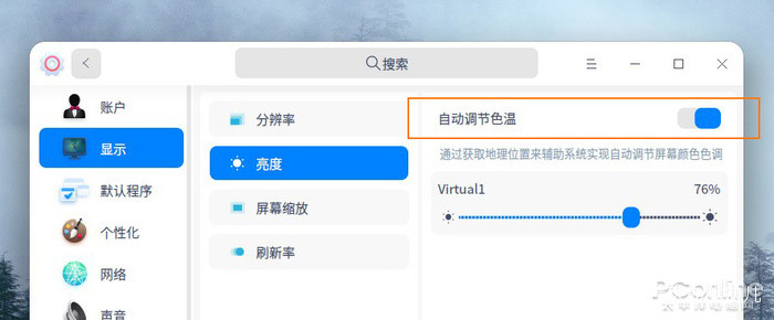 此外,它也可以自動調節色温。不過由於我們用的是虛擬機,看不到實際效果。目測應該是能夠根據用户所在地自動切換色温。