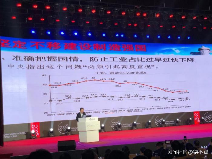 他指出,中國工業佔GDP的比例在2006年達到42%的高峯,此後以每年一個百分點的速度一路下跌,到2016年創下33.3%的最低點,應該高度重視製造業佔比過快下降的問題,警惕工業被空心化、邊緣化的狀況。