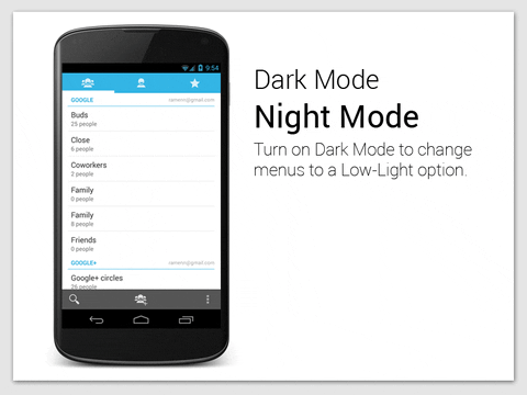 在去年的Android開發者大會上,在OLED屏幕上使用官方應用,一個開啓暗黑模式,一個沒有開啓暗黑模式,結果顯示暗黑模式有顯著的節能效果。在50%的亮度下,暗黑模式與正常模式相比,可以節省大約14%的電量;當屏幕亮度為100%時,暗黑模式與正常模式相比,可以節省差不多60%的屏幕所消耗的電量。