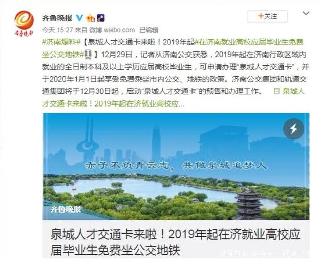 據齊魯晚報官方APP報道,2019年起在濟南行政區域內就業的全日制本科及以上學歷應屆高校畢業生,可申請辦理“泉城人才交通卡”,並於2020年1月1日起享受免費乘坐市內公交、地鐵的政策。濟南公交集團和軌道交通集團將於12月30日起,啓動“泉城人才交通卡”的預售和辦理工作。