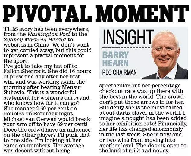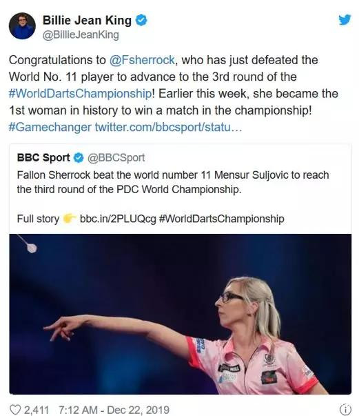 前不久,這個姑娘首次參加PDC飛鏢世錦賽,就一舉擊敗了兩名男性選手(埃夫茨、蘇爾約維奇)。這使她不僅成為歷史上第一個在飛鏢世錦賽取勝的女性選手,也成了當今性別平權運動最有力的代言人。