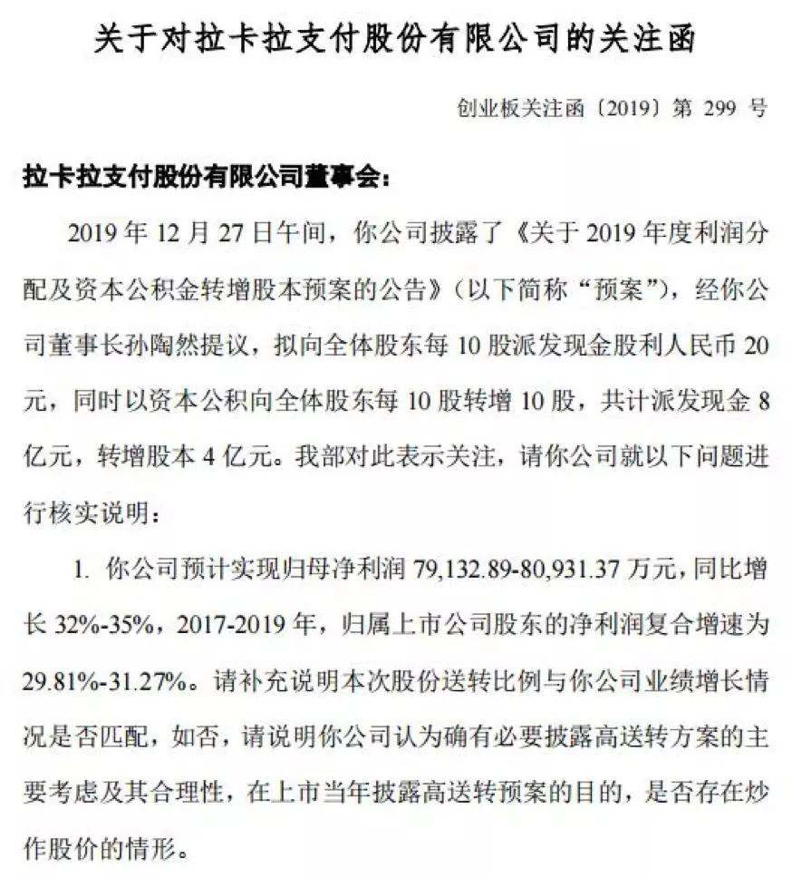 針對本次派息,12月30日開盤前,深交所向拉卡拉下發關注函,要求其補充説明股份送轉比例與公司業績增長是否匹配?如否,請説明公司認為確有必要披露高送轉方案的主要考慮及其合理性,在上市當年披露高送轉預案的目的,是否存在炒作股價的情形。