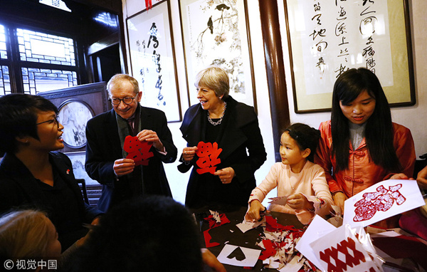 英國首相特蕾莎·梅到訪上海,偕夫遊覽豫園學剪“福”字。@視覺中國