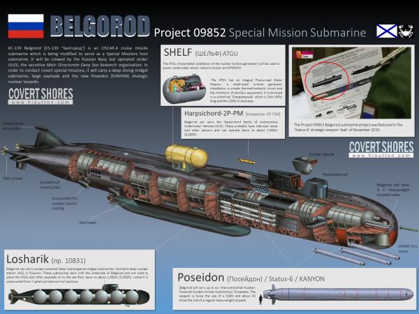 據報道,目前有擔負特殊用途的“哈巴羅夫斯克”號核潛艇正在北德文斯克造船廠建造中,該艇將成為“波塞冬”核魚雷的初始搭載艇。而未來,類似的特殊潛艇和經過特殊改造的949A型(北約代號“奧斯卡II”級)核潛艇將被用於攜帶“波塞冬”魚雷。