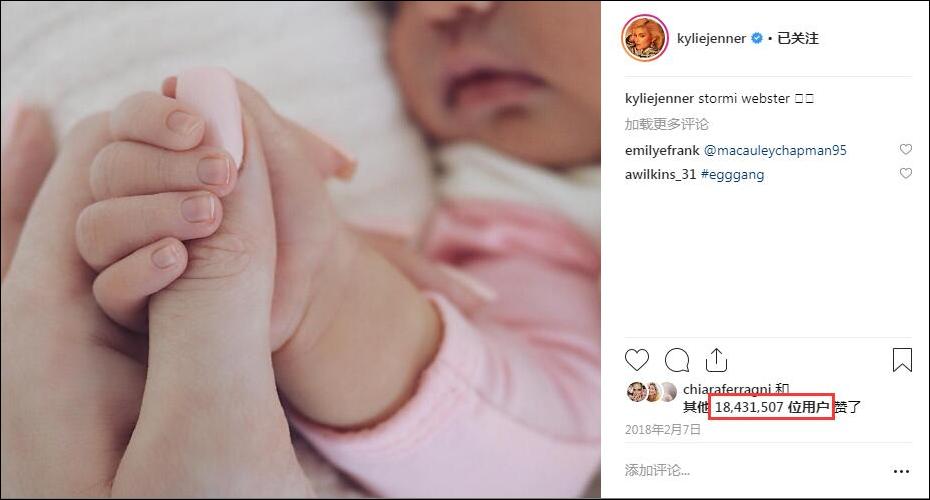 去年2月7日,凱莉詹娜發佈了自己剛出生女兒的照片,女兒微小的手抓住她的拇指,露出下半部分臉,看起來十分有愛。沒過幾天,帖子點贊數就超過了1800萬,成為ins上點贊數最高的照片,打破了此前碧昂絲宣佈自己懷上雙胞胎時的紀錄。