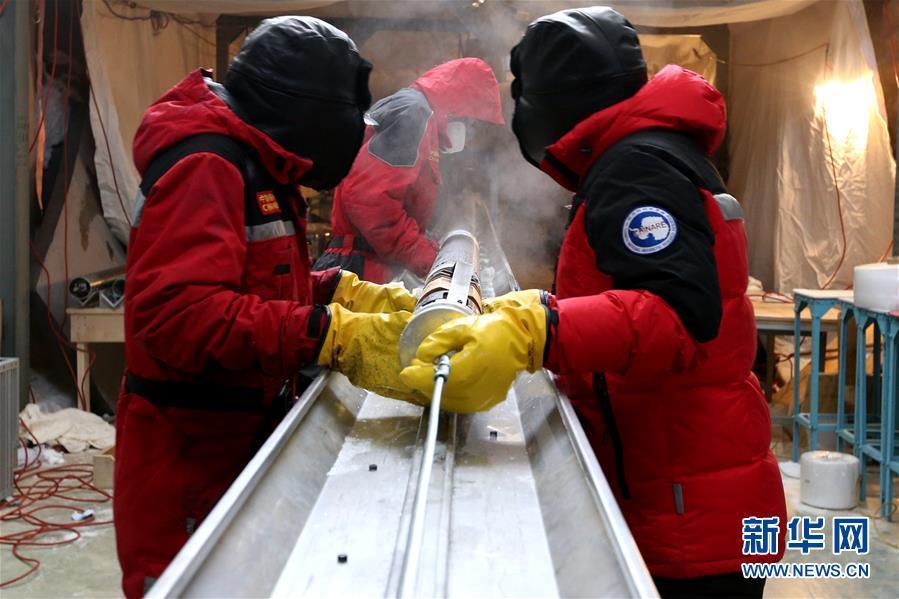 科考隊員處理鑽取的2.8米長冰芯(圖片來源:新華網,1月12日攝)