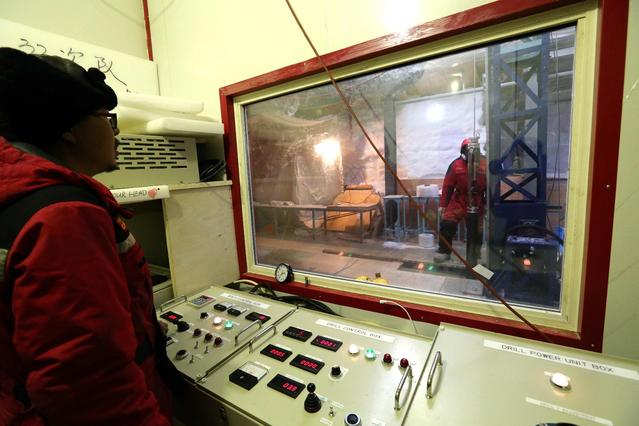 12日11時,維護後的今年第一鑽正式啓動。隨着鑽塔架緩緩豎起,範曉鵬熟練地操作着控制器,將鑽機緩緩送入鑽探導向孔。12時30分,鑽機下放深度已經到達800米,即第33次科考隊鑽進的最終深度。範曉鵬繼續使鑽具向下鑽進2.8米後,果斷提鑽,一支2.8米長的冰芯展現在大家面前。