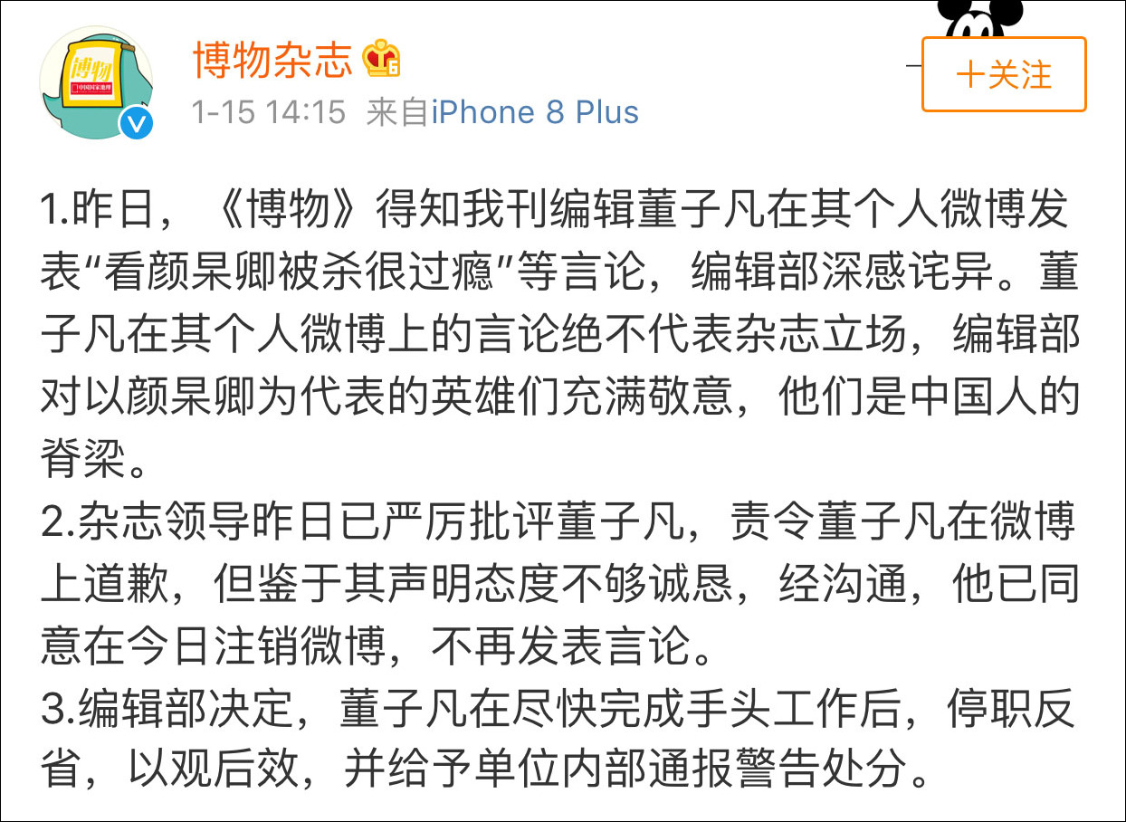 15日下午,@博物雜誌 公佈針對編輯董子凡在個人微博發表“看顏杲卿被殺很過癮”等不當言論的處理結果: