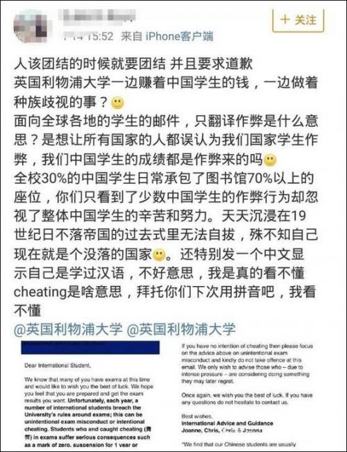 【文/觀察者網 秦璐】又到期末季,英國利物浦大學(University of Liverpool)的留學生們收到一封郵件,郵件內容是提醒大家不要作弊。但令人匪夷所思的是,郵件中竟專門用中文標註了“舞弊”一詞。因涉及“種族主義”,中國留學生強烈抗議,校方最終對此事發表道歉聲明。