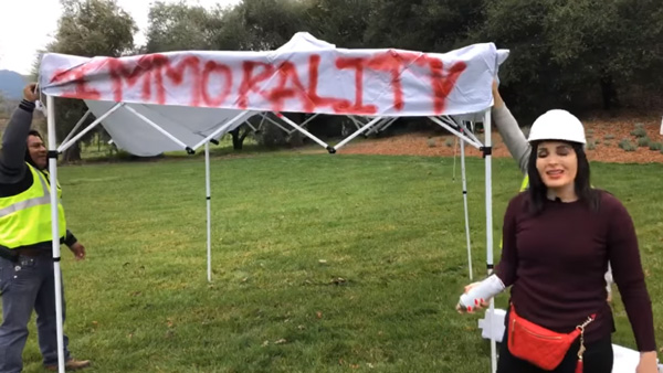 據《華盛頓時報》報道,1月14日,美國右翼活動家勞拉•盧默(Laura Loomer)帶着三名自稱非法移民的“朋友們”進入了民主黨領袖南希•佩洛西(Nancy Pelosi)在加州的家中,還在草坪上了建起了寫着“不道德”的“庇護所”。