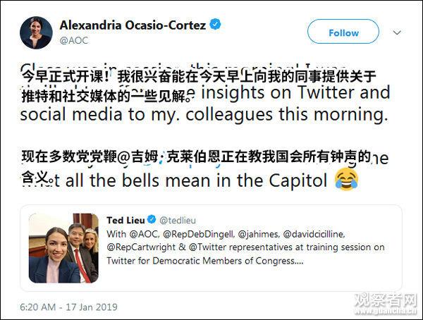據CNN於17日報道,美國新科民主黨議員科爾特斯(Alexandria Ocasio-Cortez)和康涅狄格州民主黨議員吉姆·西姆斯(Jim Himes)一起主持討論了“如何將推特作為一個有效和真實的信息工具來與他們的選民建立聯繫”和“數字化故事的重要性”兩個主題。
