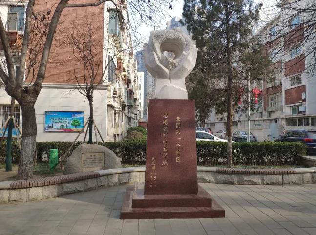 △這座雕塑是朝陽里社區引以為豪的一大地標。2009年3月,朝陽里社區被國家民政部認定為“全國第一個社區志願者組織發祥地”。(央視記者王晶磊拍攝)