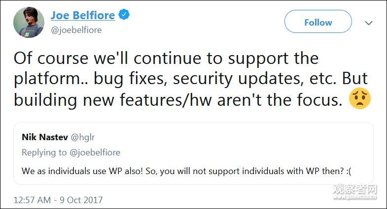 而在2017年10月,微軟操作系統事業部全球副總裁貝爾費奧利(Joe Belfiore)就曾以推特形式對外公佈,Windows移動操作系統功能及硬件的開發,**將不再是微軟未來工作的重點。**但他表示,會持續對Window 10移動操作系統進行更新。