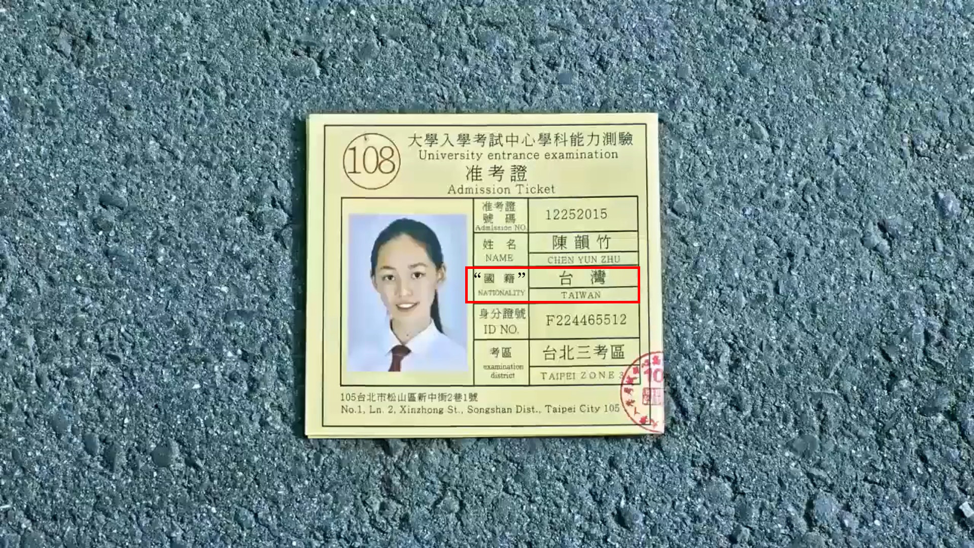 但是其中卻出現了這樣一個疑似“挺台獨”的鏡頭:廣告中女主准考證的“國籍”一欄寫着“台灣”字樣,且這個鏡頭停留了有2秒鐘時間。