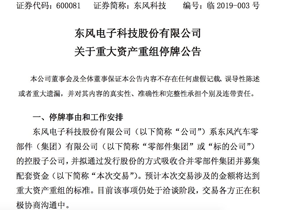 【觀察者網汽車頻道報道】1月18日,東風汽車零部件(集團)有限公司(簡稱“東風零部件”)的控股子公司——東風科技(600081)發佈重大資產重組停牌公告稱,擬通過發行股份的方式吸收合併東風零部件集團並募集配套資金,預計本次交易涉及的金額將達到重大資產重組的標準,因有關事項尚存不確定性,公司股票自2019年1月21日開始起停牌,力爭5個交易日內復牌。