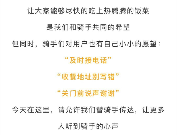 昨晚(20日),一位ID為“闌夕”的微博網友發文表示,2018年某外賣平台的騎手們,最想對客户們説的三句話是“及時接電話;把收餐地址寫對;收餐時説聲謝謝”。