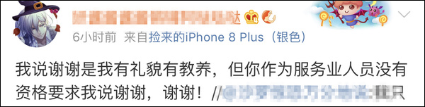 揪住外賣員“要求”顧客感謝的這句話,有人怒懟,自己有沒有表示感謝完全屬於個人權利,一個“小小”的服務業人員有什麼資格提出這樣的“強硬性”要求?