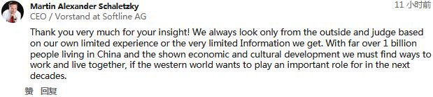 Martin Alexander Schaletzky:非常謝謝您的這些觀點!我們總是從外部看中國,我們總是根據自己有限的經驗或所獲得的非常有限的信息來對中國做出判斷。中國有10多億人口,而且我們已經見證了中國所取得的經濟和文化成就。如果西方希望在未來幾十年裏繼續在世界上扮演重要角色的話,我們就必須找到與中國人共存的辦法。