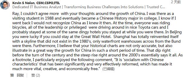 Kevin S Nolan, CSM,CSPO,ITIL:雷·達里奧,我特別贊同你關於中國何以能實現如此發展的觀點。1988年我曾去中國做進修生,因為這段經歷我最終選擇了攻讀中國歷史專業。我知道,如果當時半途而廢,我就不會具備今天這樣的對中國的理解程度。當時中國老百姓都騎着自行車,而領導們坐的汽車是豐田牌的。你在文中提到的陰暗的旅館,我也是住過的。當時如果你能在北京住上長城飯店,那麼説明你的運氣還算不錯。上海完全變了樣,如今上海的城市天際線在80年代是不存在的,不過外灘附近的倉庫如今還保留着。你在文中給出的歷史數據圖表不僅準確,而且生動地展示了中國在如此短的時間裏面是如何實現如此大幅的增長的。20世紀大轉折之前他們直線下墜,而在2000年左右開始陡然上升。我想補充一點,我尤其喜歡這句話:“‘有中國特色的社會主義’是經過大規模且有效的改革所得出的結果,它使中國社會變得更有活力、更有創造力而且使中國的經濟變得更加自由”。