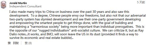 erold Martin:在過去30年裏我也曾多次去過中國,對於中國的發展變化,我也是親眼所見。在某種程度上來説,中國人是羨慕我們的自由的,可他們並不羨慕我們互相掣肘、妨礙國家發展的兩黨政治,他們認為自己的一黨制正處於發展過程中而且有利於那些最聰明的人把事情辦成。中國人的目標是建設和保持一種“和諧的社會”,而不是個人主義的特權。中國人的觀念與我們“無所顧忌的個人主義”和反社會主義的文化觀念是完全相反的。我們可以批評他們的觀念,不過正如雷·達里奧在文中所説,中國的模式的確是行得通的。在我個人看來,如果中國能破解經濟和房地產泡沫難題的話,他們很快就會超過我們。