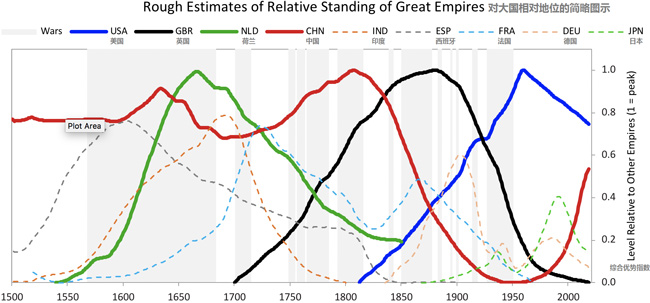 我所領導的研究小組把自1500年以來世界上曾出現過的主導性國家的六大指標(體現了一個國家在六個不同領域的實力)做了分析:創新能力和競爭力(innovation&competitiveness)、國內經濟產出(domestic output)、進出口總額佔世界貿易額的比例(share of world trade)、金融中心規模與實力(financial-center size and power)、軍事實力(military strength)以及儲備貨幣地位(reserve-currency status)。