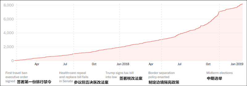 1月21日,《華盛頓郵報》根據旗下數據庫“Fact Checker”統計指出,自特朗普上任以來,短短兩年內已經發布了8158條虛假或誤導性言論,大多數出現在第二年,有超過6000條。
