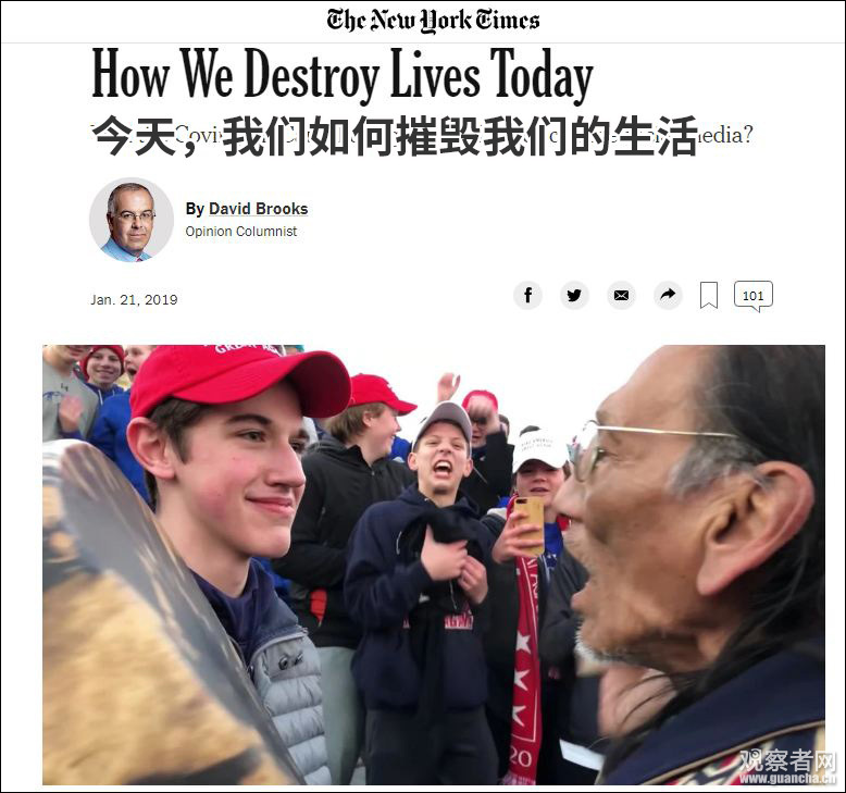 21日,《紐約時報》發了一篇專欄作家大衞·布魯克斯(David Brooks)寫的文章《今天,我們如何摧毀我們的生活》。