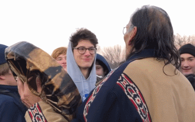 在instgram上傳的另一段視頻中,這位擊鼓老人説,一些學生在高喊“修那堵牆”,他邊説邊擦眼淚:“這是原住民的土地,這裏不應該有圍牆。一千年來我們從未這樣做過。我們從未有過監獄,我們總是照顧我們的長輩,照顧我們的孩子,供養他們,教他們明辨是非。我希望我能看到那種能量……把精力用在讓這個國家變得非常非常偉大上。”