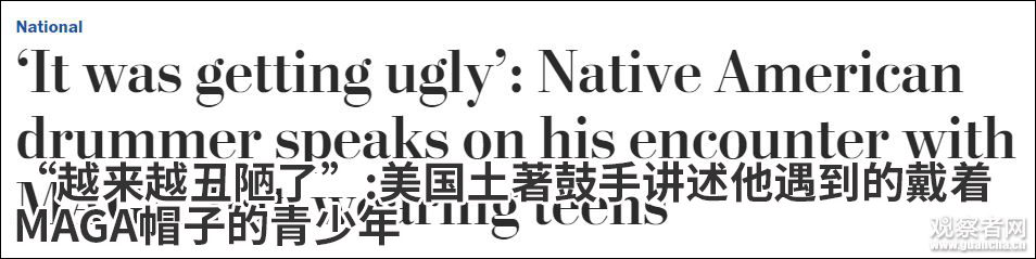 當地時間上週五(1月18日),有人在社交媒體instagram上傳了一段“戴着MAGA帽子的男孩與原住民老兵對峙”的視頻。(觀察者網注:MAGA帽子即特朗普標誌性的小紅帽,代表其“讓美國再次偉大”make America great again的口號)