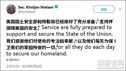 上週,佩洛西發信要求特朗普推遲國情諮文至政府開門後,理由是在政府停擺期間,特勤局和國土安全部無薪工作,無法保證安保措施的完善。不過,特勤局和國土安全部部長髮推文回應在安全方面做好了“充分準備”。