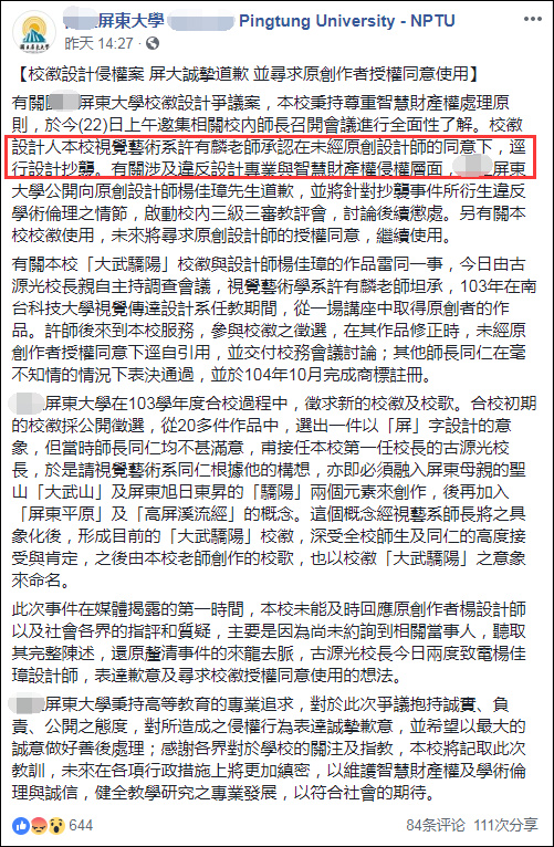 台灣屏東大學校徽設計日前引發爭議,校徽設計人視覺藝術系老師許有麟1月22日承認,未經原創設計師同意,進行了設計抄襲。屏東大學當天發聲明向原創設計師楊佳璋道歉,楊佳璋表示接受學校道歉。