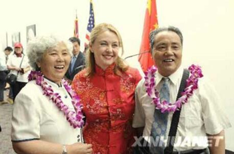 2008年6月19日,中國公民赴美旅遊首發團的遊客與美國旅遊國際公司的董事主席兼CEO漢努瑤(中)在華盛頓國會山合影。(圖片來源:中國網)