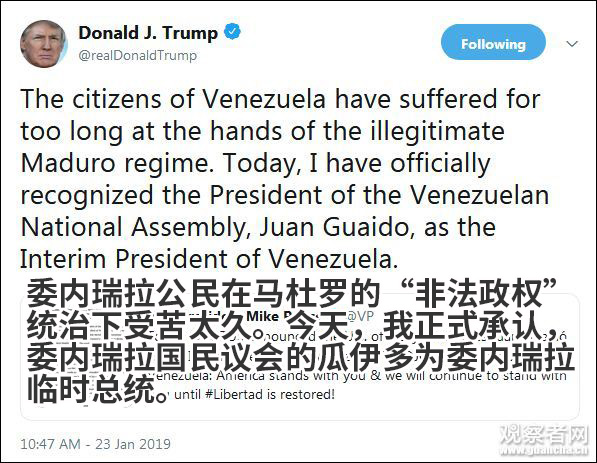 特朗普承認瓜伊多為委內瑞拉“臨時總統”
