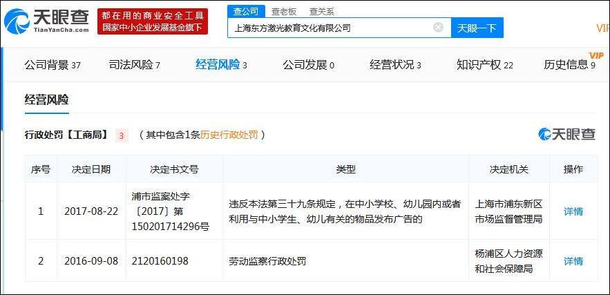 2017年,該校因在中小學校、幼兒園內或者利用與中小學生、幼兒有關的物品發佈廣告而被上海市浦東新區處以行政處罰。