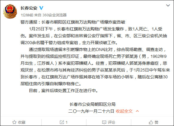 吉林長春市公安局官方微博1月26日發佈通報,1月25日下午,長春市紅旗街萬達購物廣場發生爆炸,致1人死亡、1人受傷。案件發生後,在公安部和吉林省公安廳指揮下,省、市、區三級公安機關抽調200餘名精幹警力組成專案組,全力開展偵破工作。