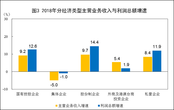 2018年,規模以上工業企業中,國有控股企業實現利潤總額18583.1億元,比上年增長12.6%;集體企業實現利潤總額102.2億元,下降1%;股份制企業實現利潤總額46975.1億元,增長14.4%;外商及港澳台商投資企業實現利潤總額16775.5億元,增長1.9%;私營企業實現利潤總額17137億元,增長11.9%。