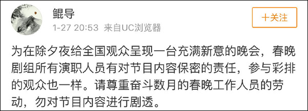 劇透的節目詳細內容很快引發網友熱議,隨後,央視春晚導演@鯤導 發文呼籲,希望參與彩排的觀眾尊重工作人員的勞動,勿對節目內容劇透,目前該博文已刪除。