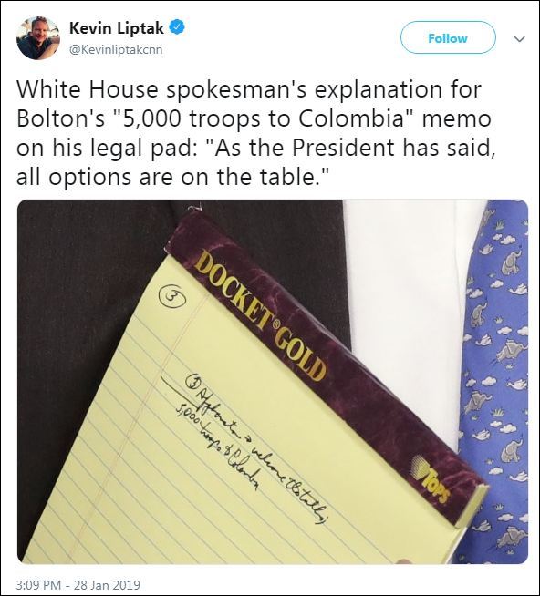 也是在28日的新聞發佈會上,有記者在博爾頓的筆記本上看到了幾條潦草的筆記。CNN記者凱文(Kevin Liptak)在推特上發出博爾頓筆記的照片,上面寫着“阿富汗→**歡迎會談”、“向哥倫比亞派遣5000名士兵”。**據他表示,白宮發言人對此的解釋是“正如總統所説,所有選項都擺在桌面上”。