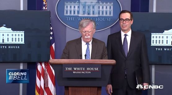 28日記者會上,美國宣佈制裁,博爾頓(左)、姆努欽(右) CNBC視頻截圖