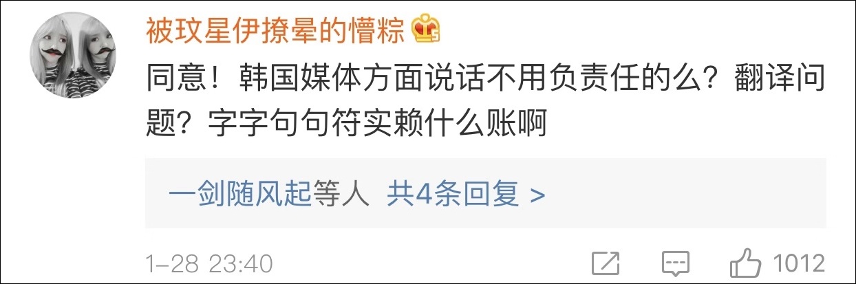 28日晚,製作該視頻中文版字幕的@鳳凰天使TSKS 發佈聲明稱,反反覆覆上上下下左左右右檢查了幾遍,確認翻譯沒有任何問題,原韓文字幕是韓國電視台製作,只是如實翻譯。