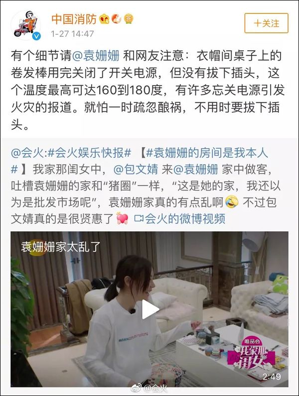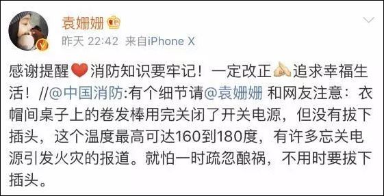 “有個細節請@袁姍姍 和網友注意:衣帽間桌子上的捲髮棒用完關閉了開關電源,但沒有拔下插頭,這個温度最高可達160到180度,有許多忘關電源引發火災的報道。就怕一時疏忽釀禍,不用時要拔下插頭。”